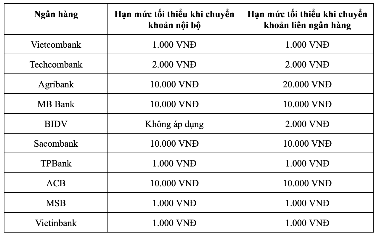 Lưu ý: Thông tin trên chỉ mang tính tham khảo. Ngân hàng có thể thay đổi quy định về số tiền chuyển khoản tối thiểu bất kỳ thời điểm nào. Vì vậy, vui lòng kiểm tra quy định ngân hàng trước khi giao dịch.