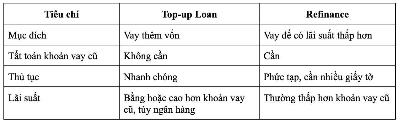 Có khá nhiều khách hàng đang bị nhầm lẫn giữa hình thức vay thêm trên khoản vay hiện tại (Top-up Loan) với tái cấp vốn (Refinance). Vì vậy, Jeff đã liệt kê những điểm khác nhau giữa 2 hình thức vay này để khách hàng dễ phân biệt:
