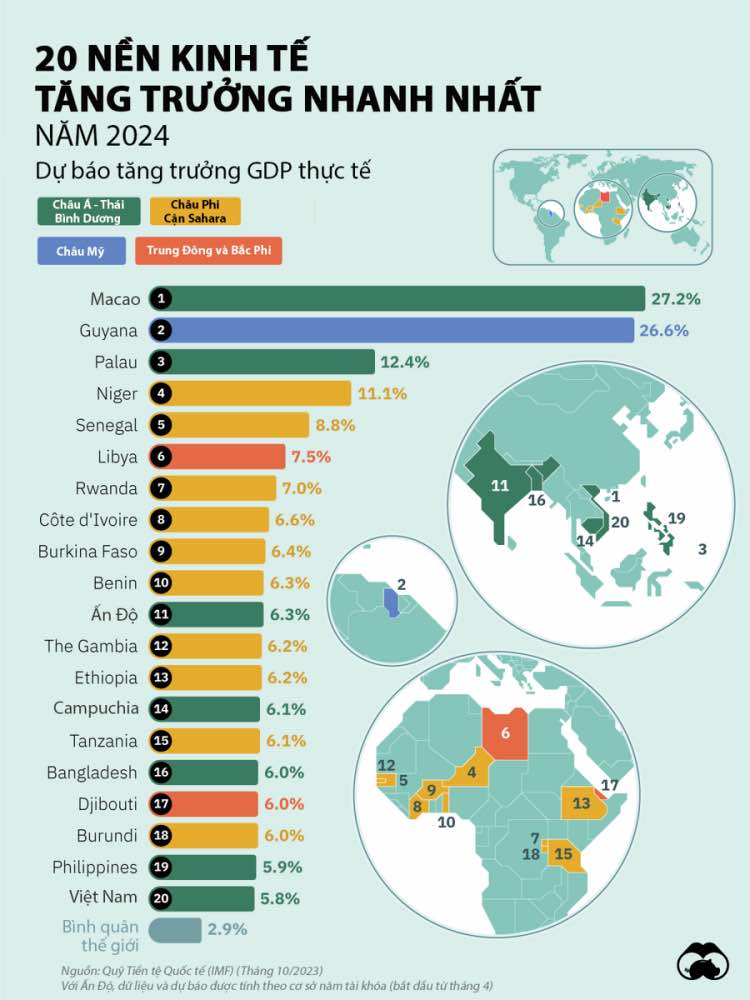 Dự báo các nền kinh tế tăng trưởng nhanh nhất trong năm 2024, Việt Nam xếp thứ 20